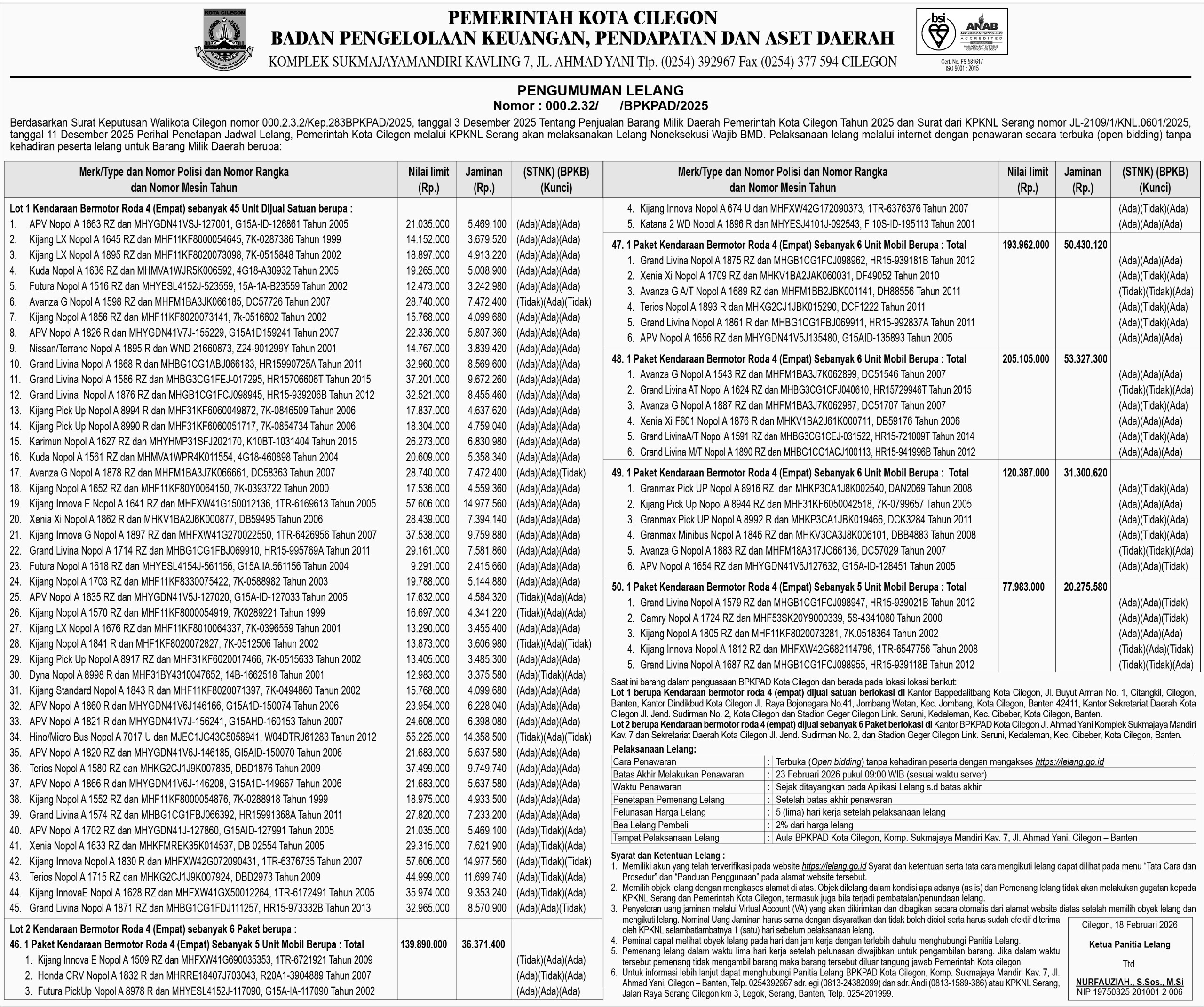 DAILYHITS.ID – Pemerintah Kota Cilegon melalui Badan Pengelolaan Keuangan, Pendapatan dan Aset Daerah (BPKPAD) Kota Cilegon akan melelang sejumlah kendaraan dinas yang sudah tidak digunakan.