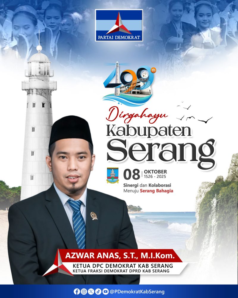 DAILYHITS.ID – Dewan Pengurus Cabang (DPC) Partai Demokrat Kabupaten Serang mengucapkan Hari Ulang Tahun (HUT) Kabupaten Serang ke-499.
