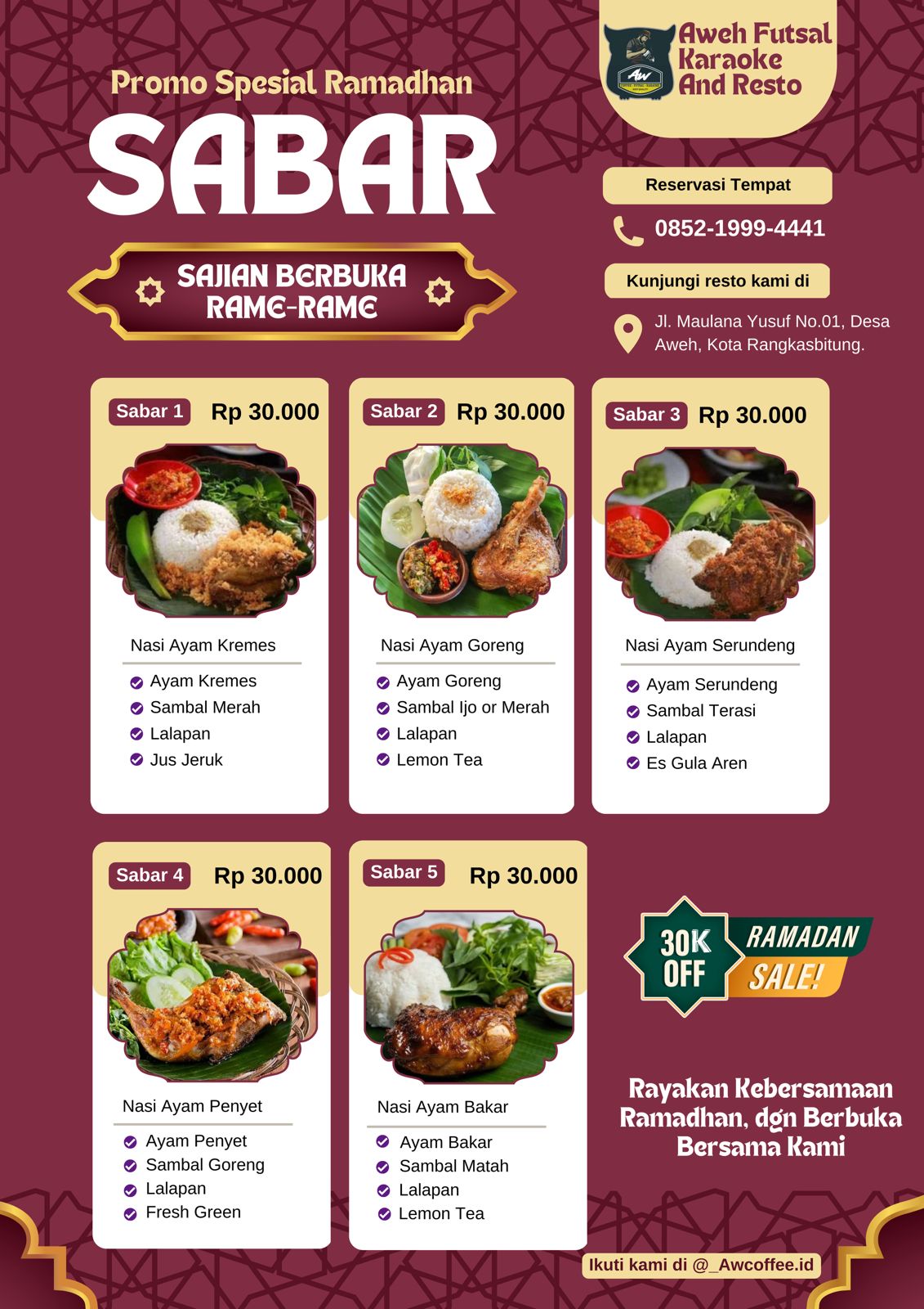 Jadi buat kalian yang bingung mau bukber di mana, Yuk cobain hidangan – hidangan lezat di AW Futsal Karaoke and Resto, untuk reservasi bisa menghubungi Instagram @_Awcoffee.id atau WhatsApp ke 0852-1999-4441. (*)