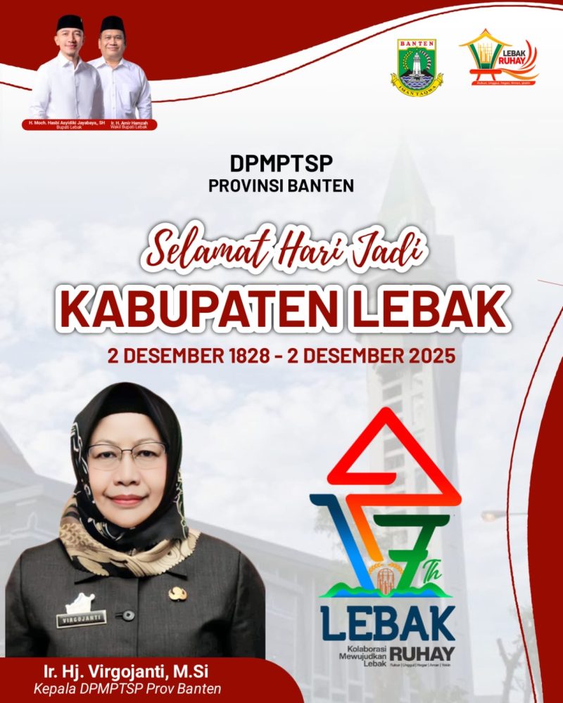 DAILYHITS– Dinas Penanaman Modal dan Pelayanan Terpadu Satu Pintu (DPMPTSP) Provinsi Banten mengucapkan Selamat Hari Jadi Kabupaten Lebak ke 197. Kolaborasi mewujudkan Lebak Rukun Unggul Hegar Aman dan Yakin (RUHAY).
